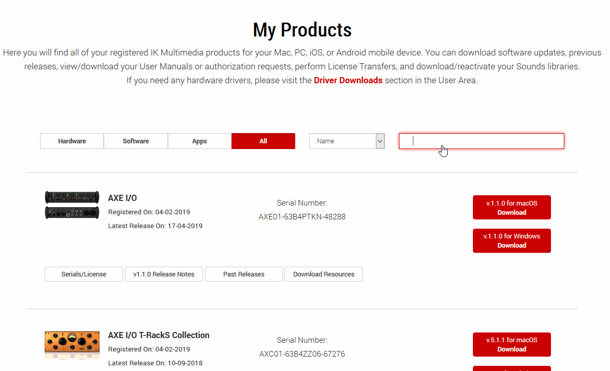 1. Find your downloads on the IK web site. These are stored in My Products. To find your version of SampleTank 4 use the Search tool.
