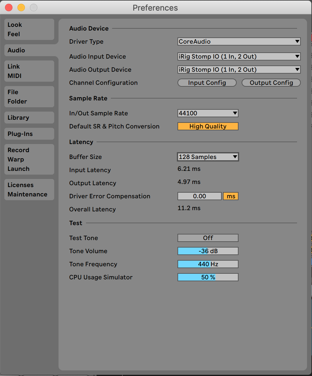 *Mac users will need to select their iRig as their audio input in their software. Below is an example of AmpliTube 4 and Ableton Live Lite. If you don't hear audio on macOS 10.14 or later, check this FAQ for help.