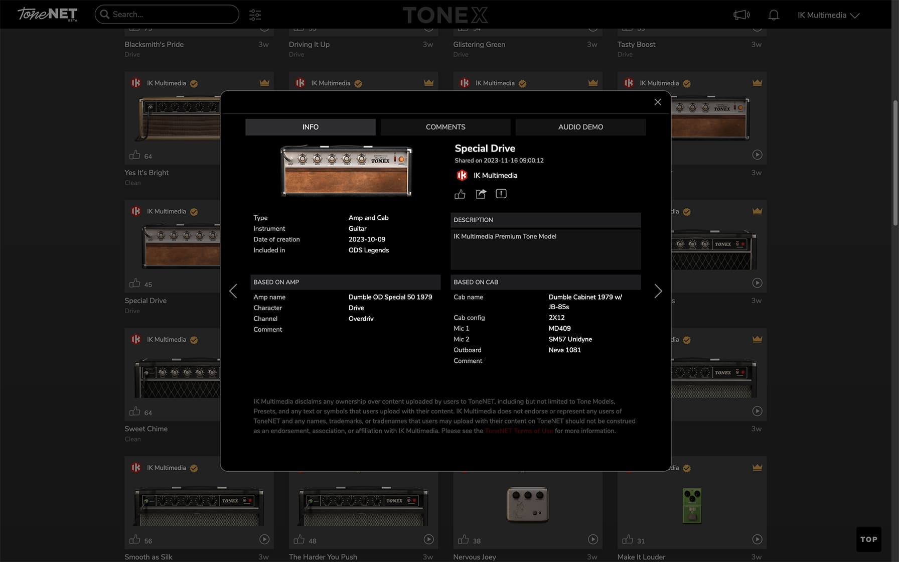 IK Multimedia disclaims any ownership over content uploaded by users to ToneNET, including but not limited to Tone Models, Presets, and any text or symbols that users upload with their content. IK Multimedia does not endorse or represent any users of ToneNET, and any names, trademarks, or tradenames that users may upload with their content on ToneNET should not be construed as an endorsement, association, or affiliation with IK Multimedia. Users represent and warrant that they own or are licensed to use all intellectual property, including copyrights and trademarks, in any content that they upload. IK Multimedia disclaims that any content uploaded by users is non-infringing. Please see the ToneNET Terms of Use with ways that you can notify us if you believe content on ToneNET infringes your rights.